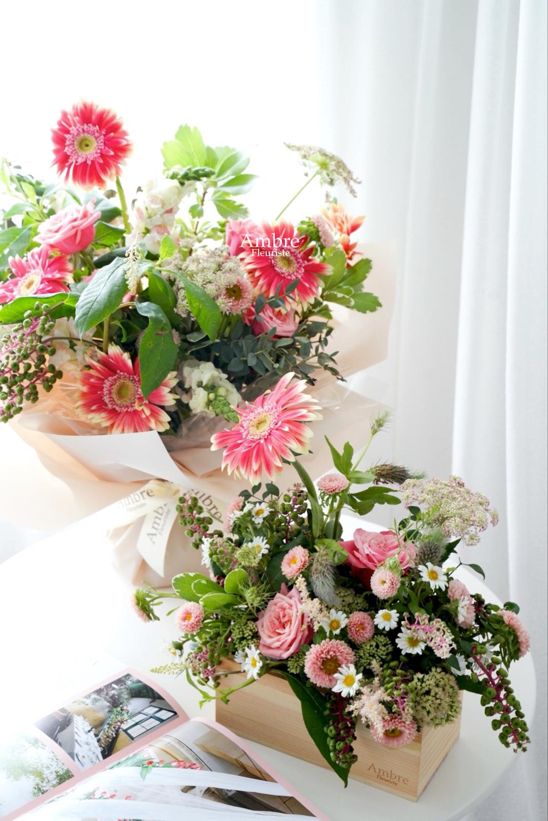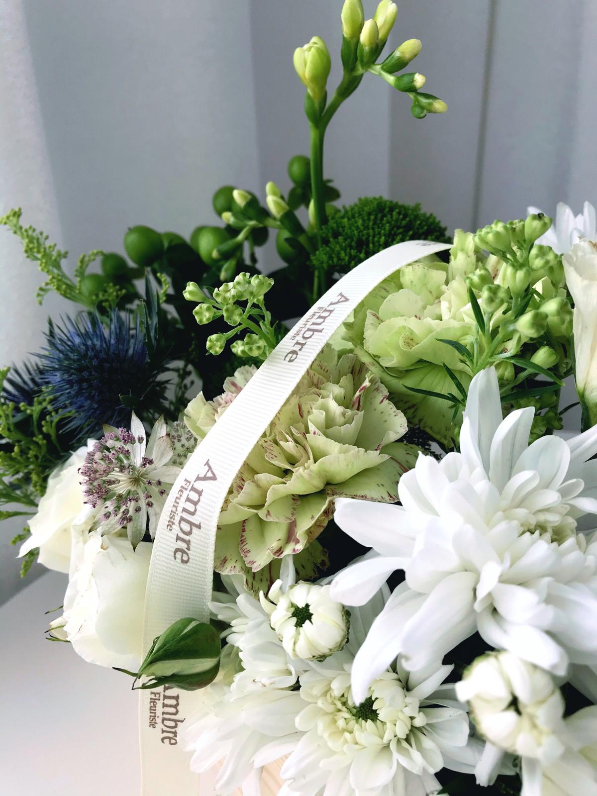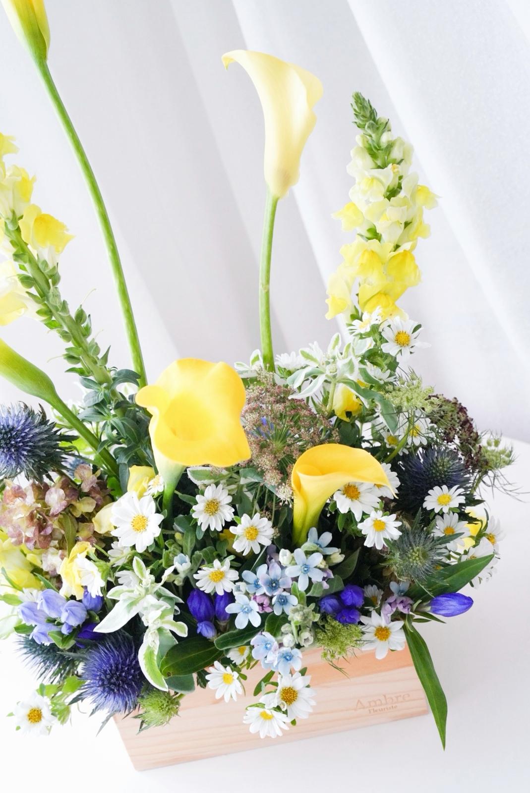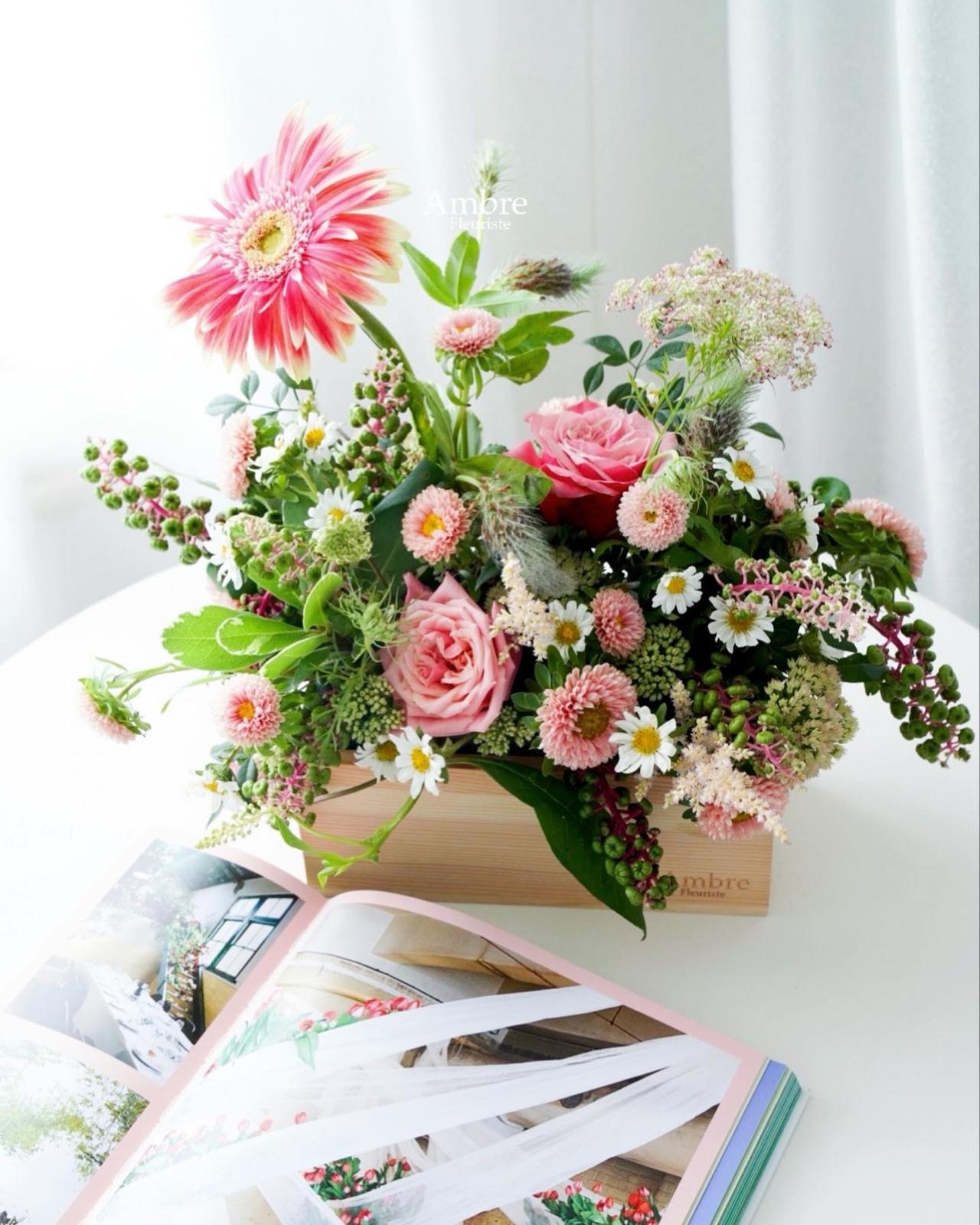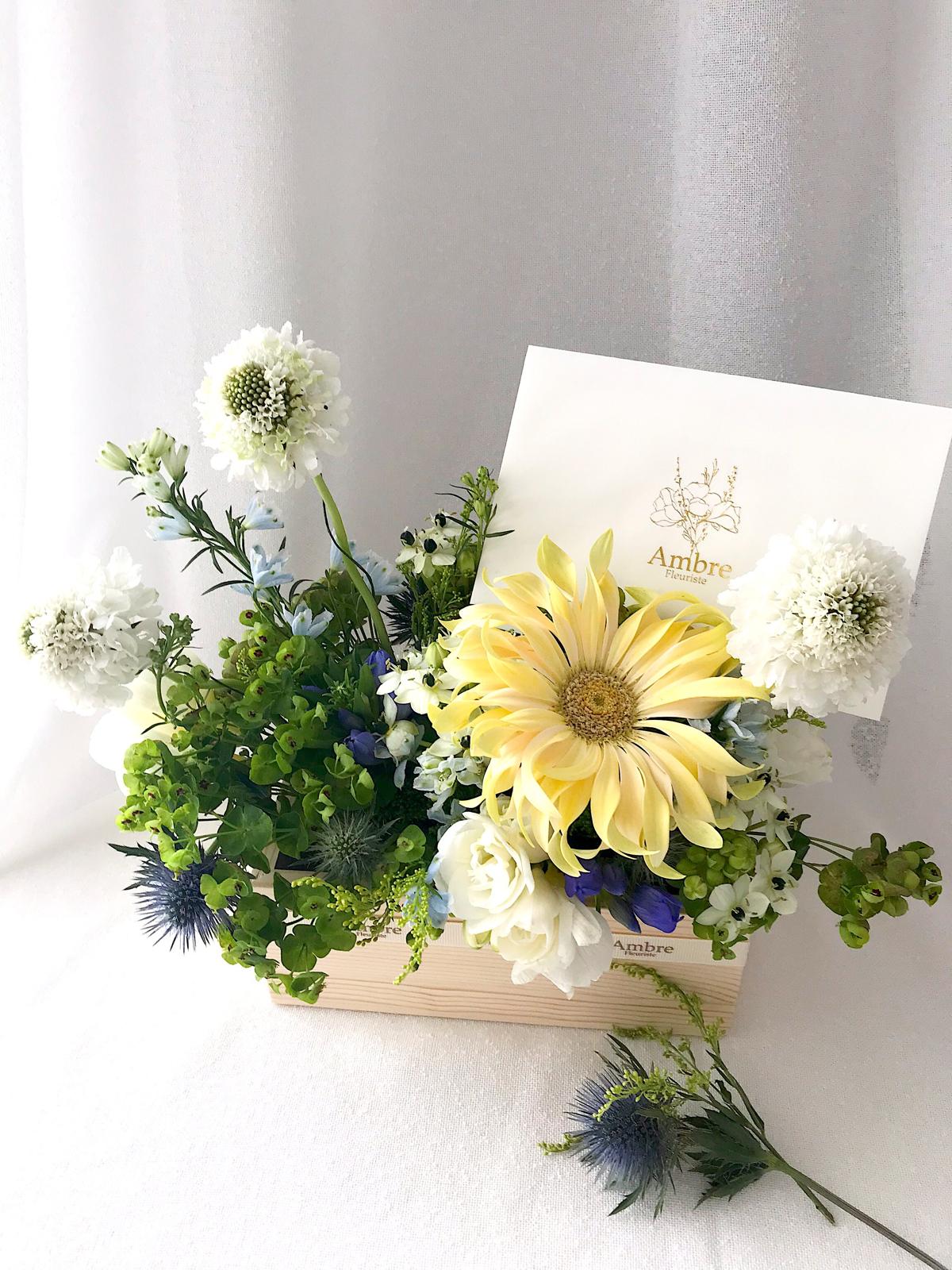A wooden box filled with seasonal bloom in neutrality. Great gift for male/ company/ event reception.